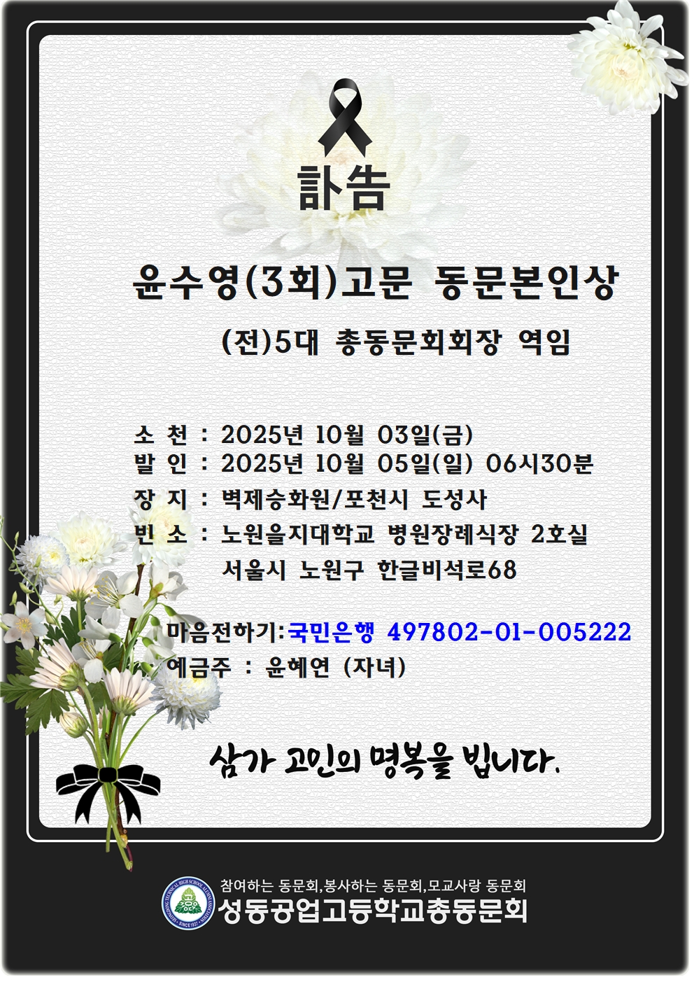 윤수영(3회)고문 동문본인상 (전)5대 총동문회장 역임 관리자 0 5 5시간전 윤수영(3회)고문 동문본인상 (전)5대 총동문회장 역임삼가고인의명복을빕니다회비(임원,연회비,평생,특별회비) 납부동문은 동문댁에 경조사 발생시 조화,화환을 사무처에서 발송하오니 참조해 주세요~^^