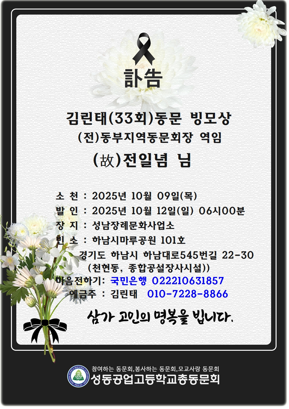 김린태(33회)동문 빙모상 (전)동부지역동문회장 (역임) 관리자 0 4 5시간전 김린태(33회)동문 빙모상 (전)동부지역동문회장 (역임)삼가고인의명복을빕니다회비(임원,연회비,평생,특별회비) 납부동문은 동문댁에 경조사 발생시 조화,화환을 사무처에서 발송하오니 참조해 주세요~^^