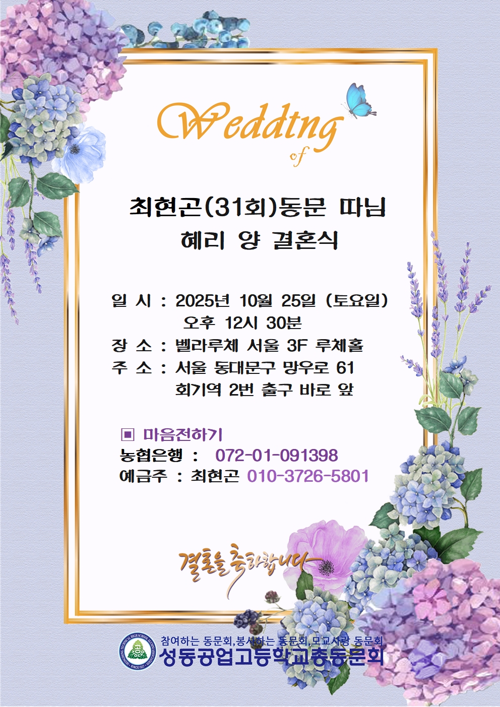 최현곤(31회) 동문 따님 결혼식 관리자 0 43 10.24 11:58 최현곤(31회) 동문 따님 결혼식축하드립니다!회비(임원,연회비,평생,특별회비) 납부동문은 동문댁에 경조사 발생시조화,화환을 사무처에서 발송하 오니 참조해 주세요~^^