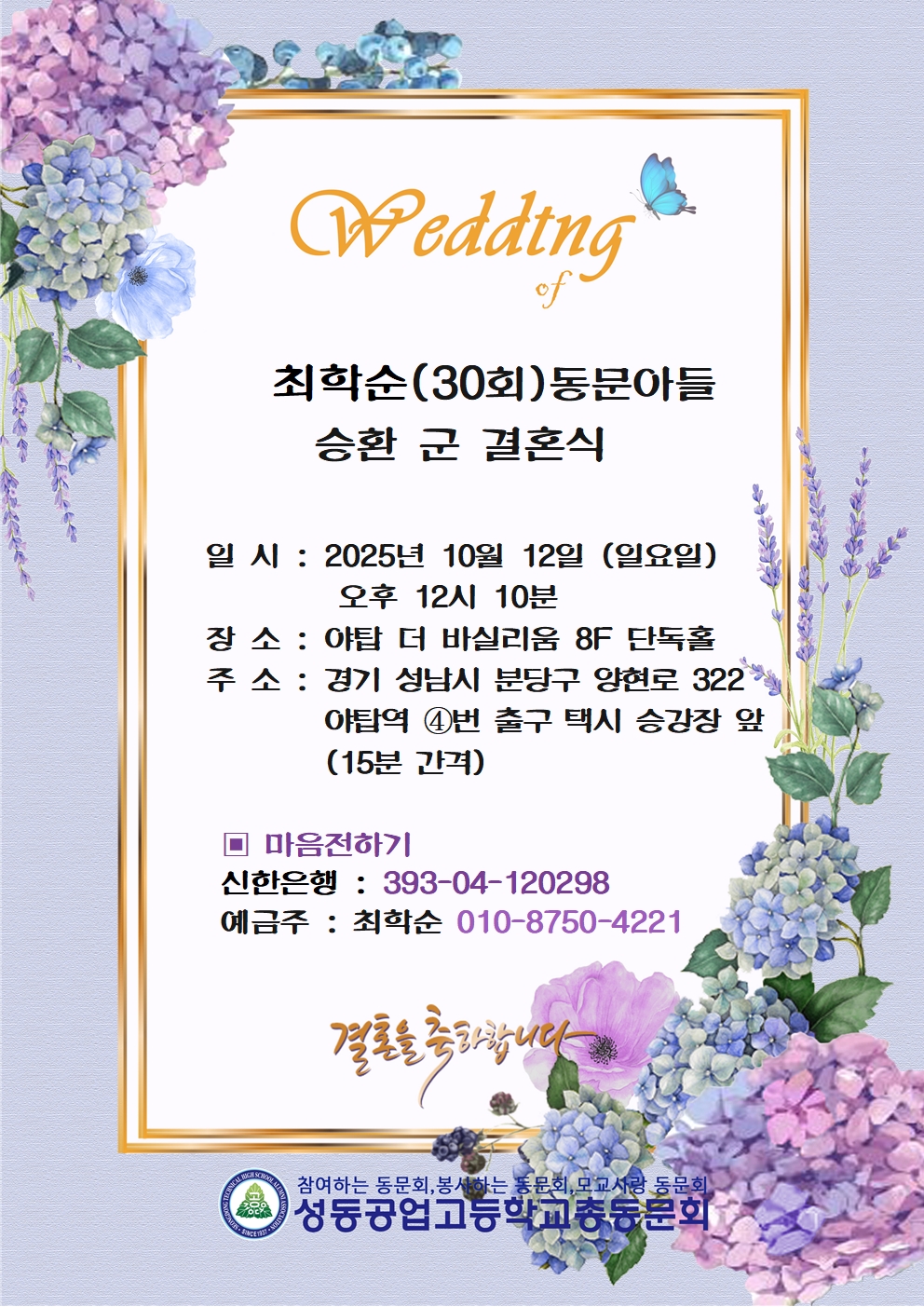 최학순(30회) 동문 아들 결혼식 관리자 0 68 10.10 16:53 최학순(30회) 동문 아들 결혼식축하드립니다!회비(임원,연회비,평생,특별회비) 납부동문은 동문댁에 경조사 발생시조화,화환을 사무처에서 발송하 오니 참조해 주세요~^^