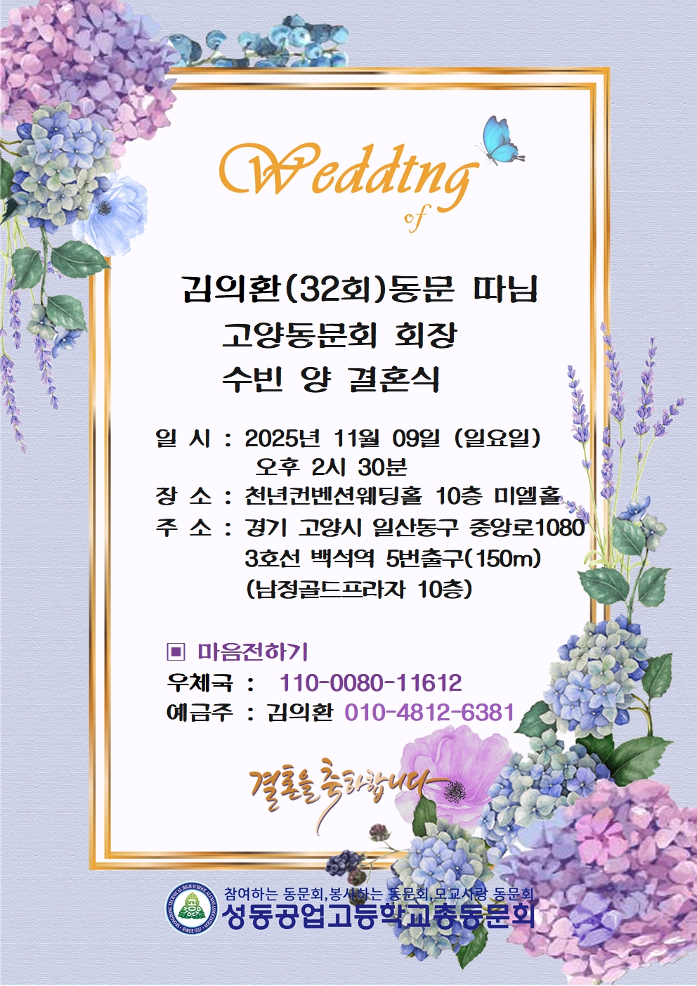 김의환(32회) 동문 따님 결혼식 관리자 0 2 4시간전 김의환(32회) 고양동문회회장 동문 따님 결혼식축하드립니다!회비(임원,연회비,평생,특별회비) 납부동문은 동문댁에 경조사 발생시조화,화환을 사무처에서 발송하 오니 참조해 주세요~^^
