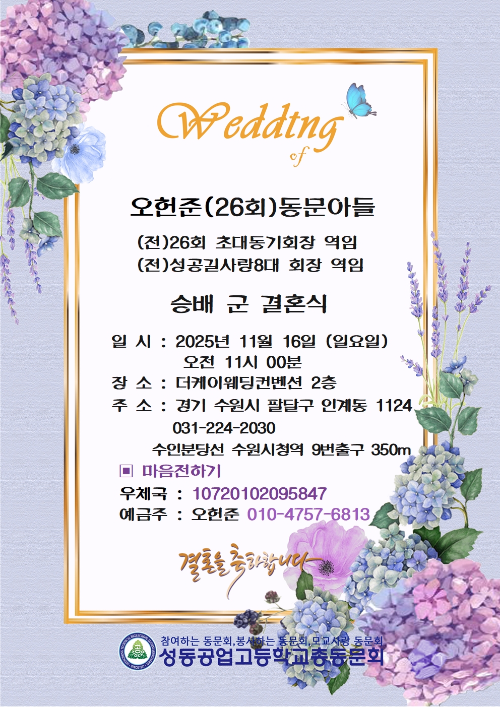 오헌준(26회) 26회 초대동기회장 동문아들 결혼식 관리자 0 3 4시간전 오헌준(26회) 26회 초대동기회장 동문아들 결혼식축하드립니다!회비(임원,연회비,평생,특별회비) 납부동문은 동문댁에 경조사 발생시조화,화환을 사무처에서 발송하 오니 참조해 주세요~^^