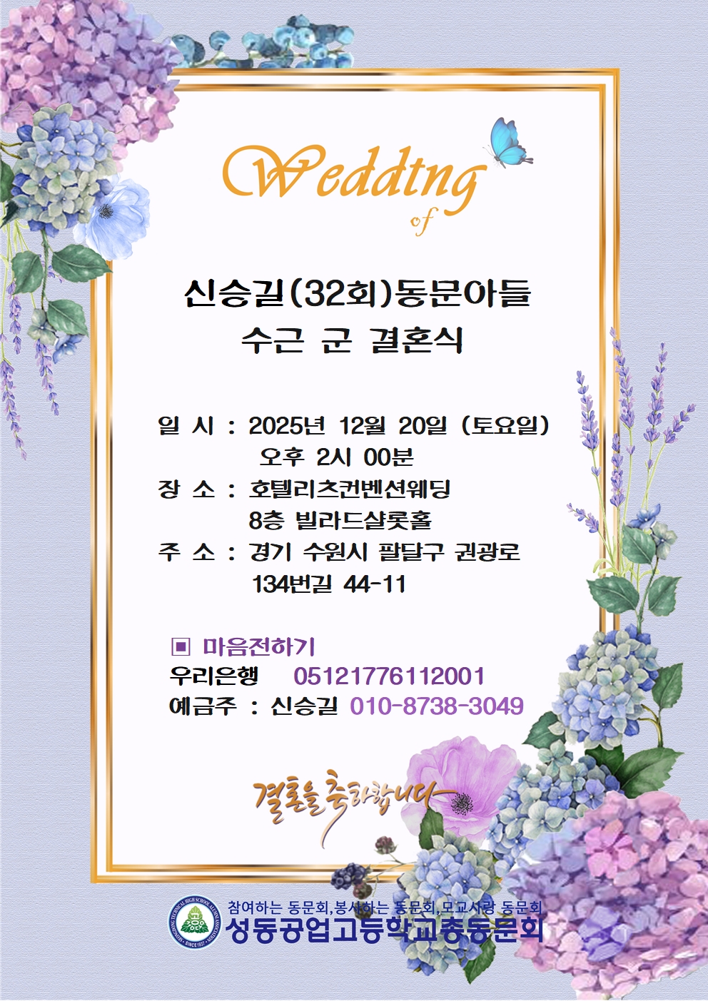 신승길(31회)동문 아들 결혼식 관리자 0 4 3시간전 신승길(32회)동문 아들 결혼식축하드립니다!회비(임원,연회비,평생,특별회비) 납부동문은 동문댁에 경조사 발생시조화,화환을 사무처에서 발송하 오니 참조해 주세요~^^